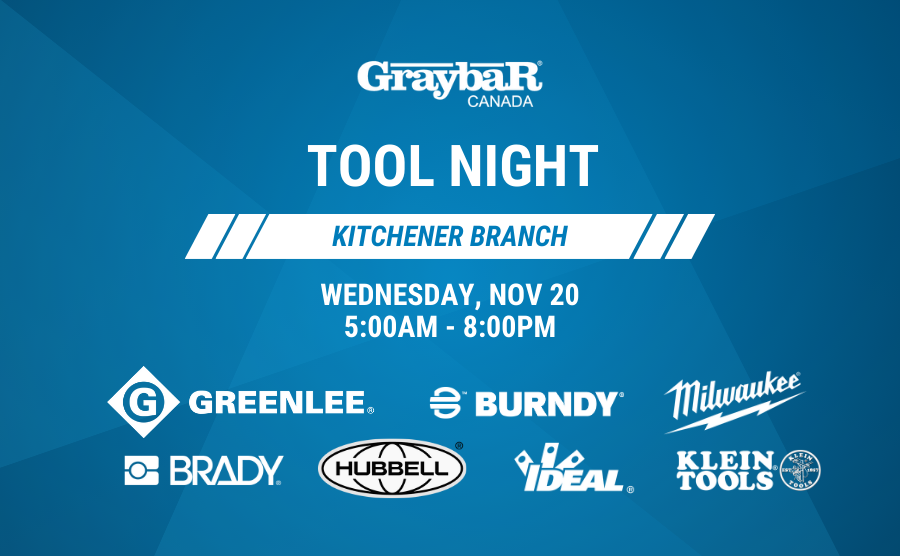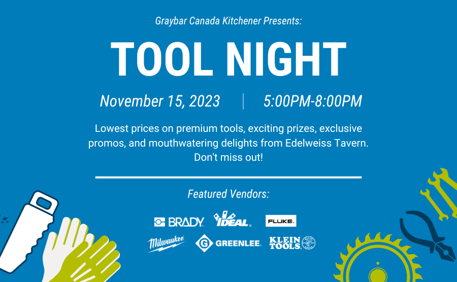 Get ready for an incredible evening at our Kitchener branch’s highly anticipated TOOL NIGHT on November 20th! Starting at 5 p.m. and running until 8 p.m., this event promises to be a perfect mix of tools, food, and great company. Catered by Edelweiss Tavern, you’ll enjoy delicious bites while exploring a showcase of top-quality brands, including Hubbell, Brady, Greenlee, Ideal, Klein Tools, Milwaukee, and Burndy. Whether you’re a seasoned pro or new to the trade, this is a night you won’t want to miss—mark your calendar and join us for an unforgettable experience! |