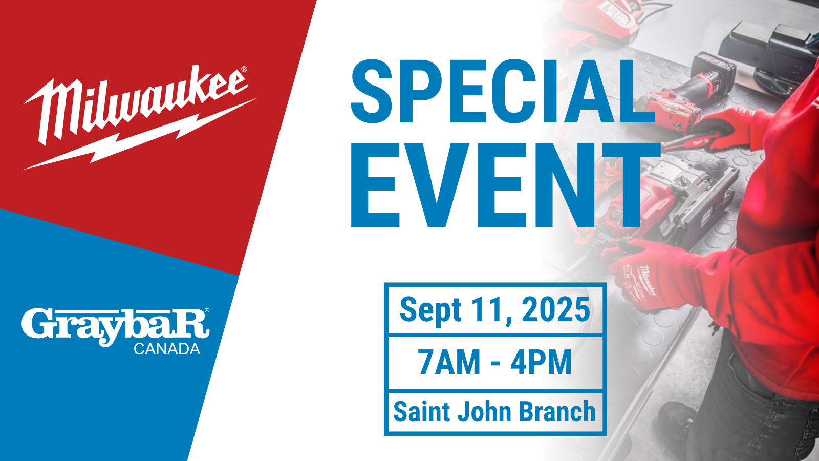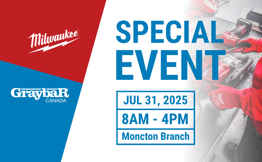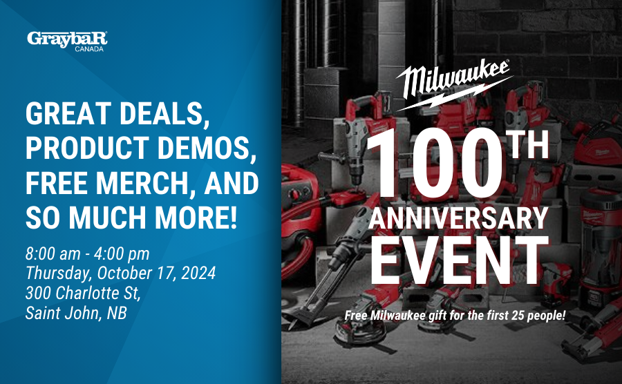 Get ready for an event like no other! On October 17th, the Graybar Canada Saint John, NB Branch will be the place to be as we celebrate Milwaukee Tool's 100-year anniversary with a ONE-DAY ONLY event. Milwaukee will be bringing the heat with live demos, free merchandise, exclusive promos and awesome prizes. And here's the real kicker: the special Milwaukee tool prices are SO shockingly low that we aren't event allowed to announce them! You've got to see it to believe it! Get ready for a day with Nothing But Heavy Duty. |